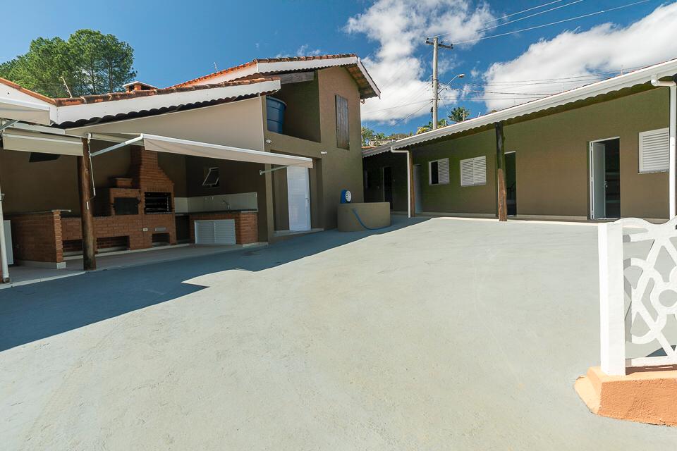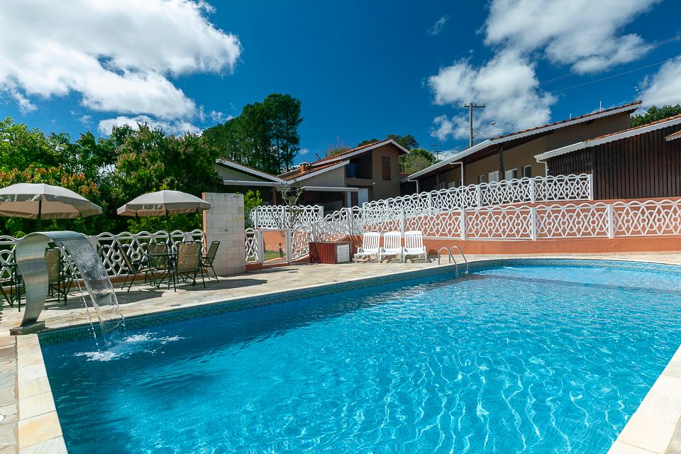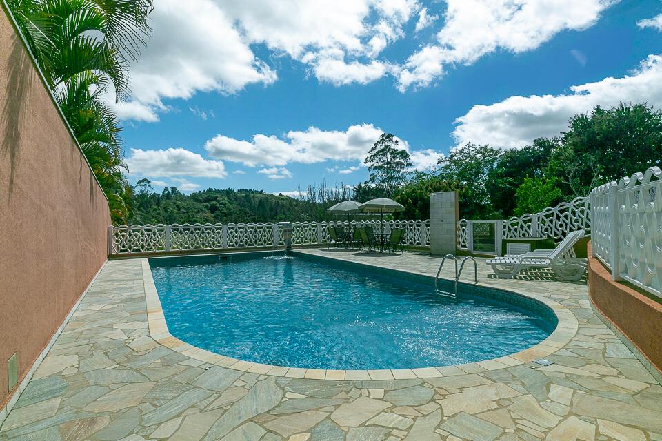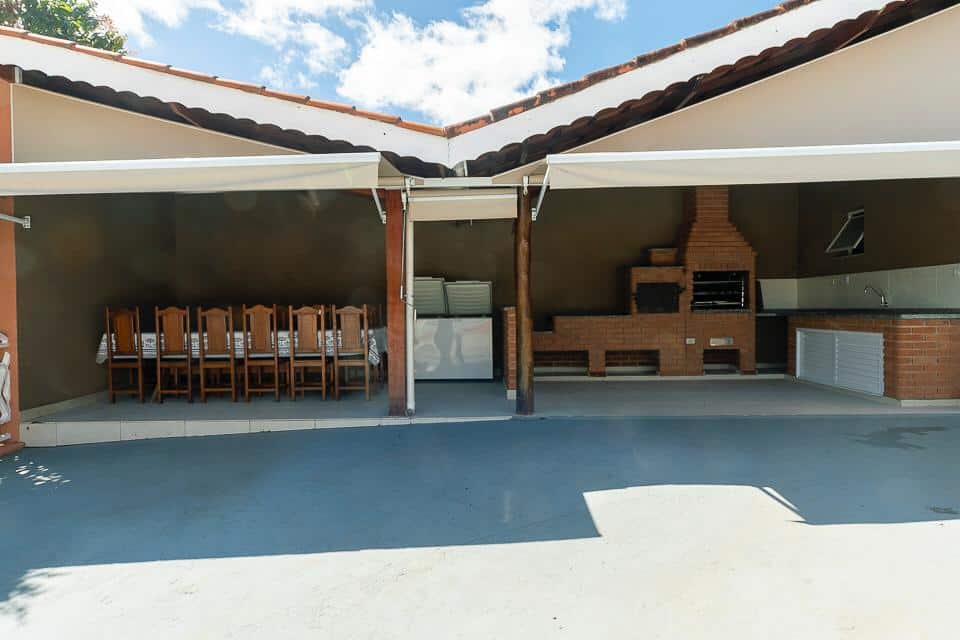A área de lazer possui uma piscina grande com água sempre bem tratada, cadeiras e espreguiçadeiras para poder aproveitar o sol com todo conforto. Além da churrasqueira, temos fogão à lenha para que a comida seja ainda mais gostosa, e na mesa cabe a família inteira, tanto para realizar as refeições quanto para jogar baralho ou jogos de tabuleiro.