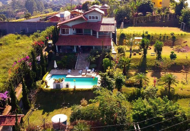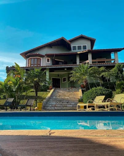 A casa acomoda até 18 confortavelmente, distribuídas em 5 suítes, com mais de 2.000 m² de terreno cercado em condomínio fechado, oferecendo segurança e tranquilidade
